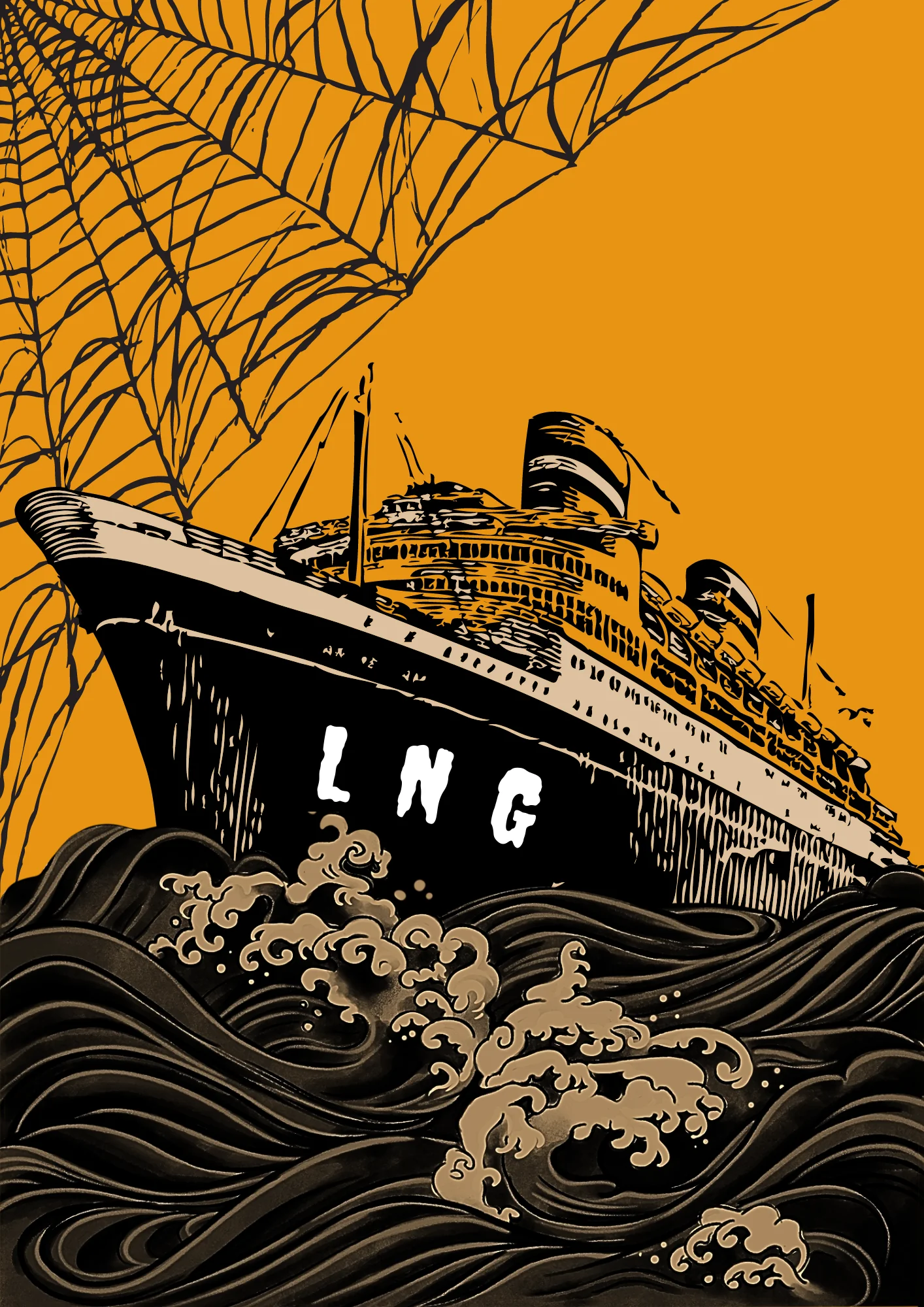 Graphic illustration by Prashanna depicting an LNG vessel atop Earth, visualizing its negative impact...